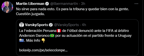 La Federación Peruana de Fútbol dio a conocer este domingo que presentó un reclamo con respecto al árbitro, Anderson Daronco, lo cual fue aplaudido por algunos hinchas y por otros no lo tomaron en cuenta, pero el periodista argentino, Martín Liberman decidió opinar con respecto a este hecho.