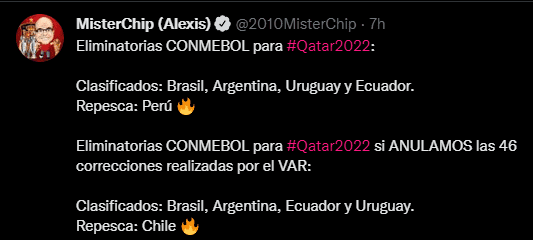 Teniendo en cuenta esto, el estadista, MisterChip, hizo que las redes sociales ardieran por la publicación que hizo, puesto que, sin el VAR, el clasificado al repechaje no habría sido el cuadro nacional, sino en su lugar habría entrado nada más y nada menos que Chile, el cuadro que terminó quedando fuera de un Mundial nuevamente.