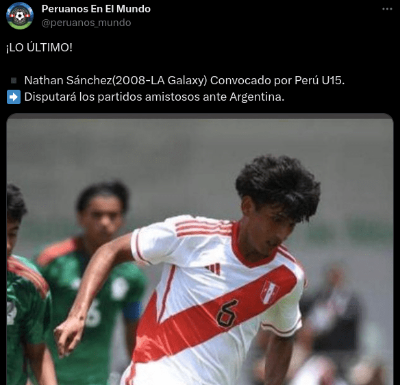 “Nathan Sánchez(2008-LA Galaxy) Convocado por Perú U15. Disputará los partidos amistosos ante Argentina”, fue lo que se ha dado a conocer en la cuenta de Peruanos en el Mundo, lo cual es una buena suma para la Selección Peruana, que espera poder tener un gran rendimiento en el próximo Sudamericano, esto es algo que se espera pueda darse de gran forma, pues en trabajo de menores las cosas no van nada bien, por lo menos en los 2 Sudamericanos Sub 20 y 17 fueron horribles, sin poder ganar partidos.