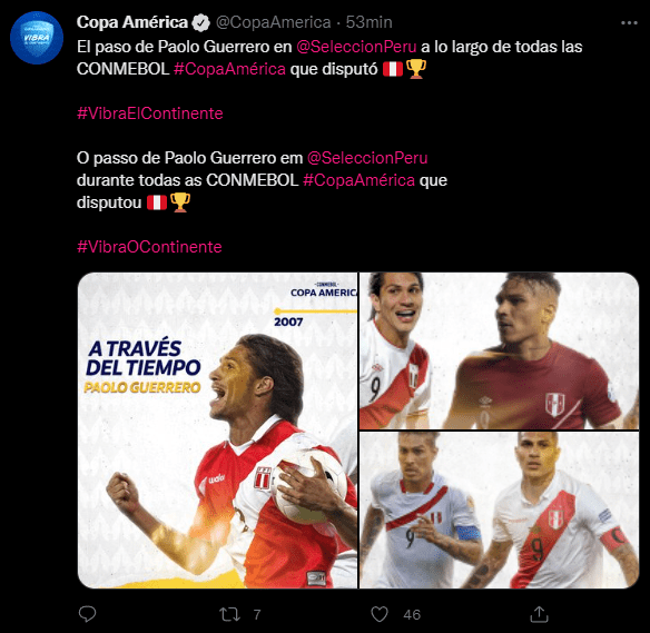 La Conmebol decidió hacer un recordatorio de uno de los mejores jugadores peruanos de todos los tiempos en la Copa América, este no podía ser otro que Paolo Guerrero quien ha sido uno de los más importantes en el fútbol peruano en este torneo, ya sea marcando goles o dando asistencias, siempre ha sido de los más importantes exponentes.