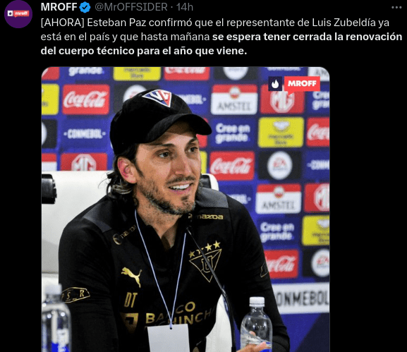 El que ya parece descartado es el DT de LDU, que todo indica que se quedará en su club, por lo que no habría forma de que pudiera llegar a la Selección Peruana. “[AHORA] Esteban Paz confirmó que el representante de Luis Zubeldía ya está en el país y que hasta mañana se espera tener cerrada la renovación del cuerpo técnico para el año que viene”, se pudo conocer por MROFF en sus redes sociales.