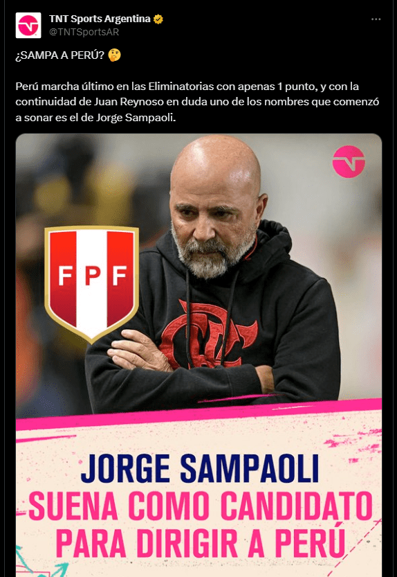 “¿Sampa a Perú? Perú marcha último en las Eliminatorias con apenas 1 punto y con la continuidad de Juan Reynoso en duda uno de los nombres que comenzó a sonar es el de Jorge Sampaoli”; es la más reciente información con la que el reconocido medio deportivo ´TNT Sports Argentina´ viene siendo tendencia en las redes sociales al soltar tremendo bomba que está paralizando al territorio nacional por lo que representaría la presencia de un DT que conoce bien la casa y que en anteriores oportunidades ya habría sonseado desde la Videna.