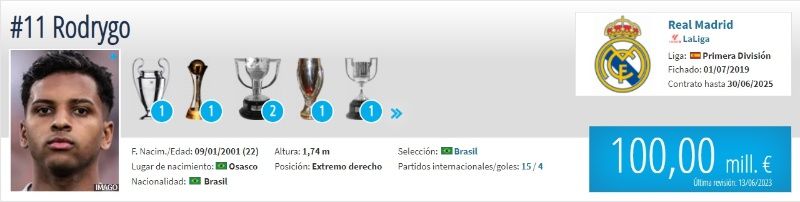 Nos referimos a Rodrygo, actual extremo del Real Madrid, quien está valorizado en 100 millones de euros. Recordemos que según dicha fuente, la Selección Peruana tiene un valor de 40,30 millones de euros. Otro futbolista brasileño que vale más del doble que todo el plantel peruano es Vinicius Junior, quien cuesta 150 millones de euros. Sin embargo, ‘Vini’ no está incluido en esta lista, ya que no forma parte del actual plantel debido a una lesión.