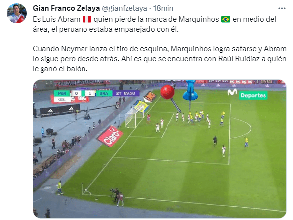 Pero la realidad es que Luis Abram es el verdadero culpable, pues pierde la marca de Marquinhos, quien al final termina anotando el 1-0. “Es Luis Abram quien pierde la marca de Marquinhos en medio del área, el peruano estaba emparejado con él. Cuando Neymar lanza el tiro de esquina, Marquinhos logra zafarse y Abram lo sigue pero desde atrás. Ahí es que se encuentra con Raúl Ruidíaz a quién le ganó el balón”, explica el periodista Gian Franco Zelaya en X.