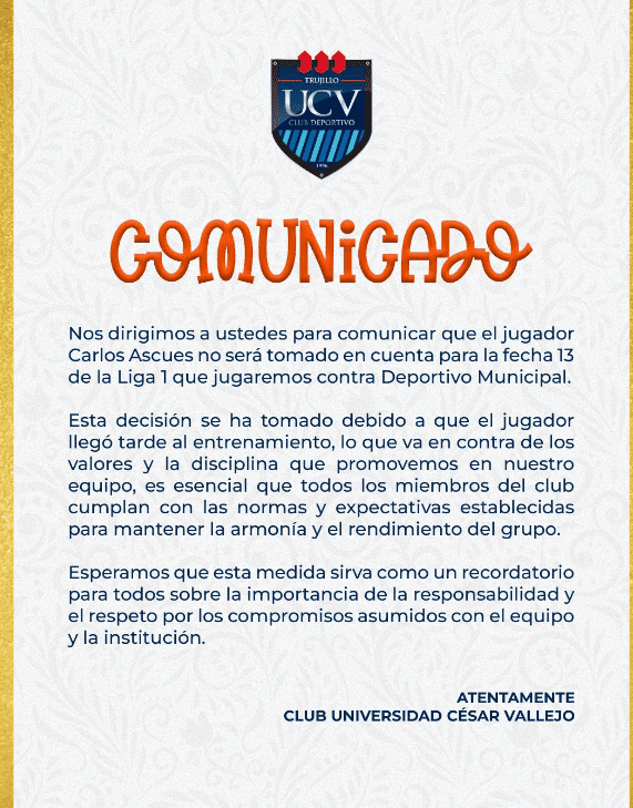 “Nos dirigimos a ustedes para comunicar que el jugador Carlos Ascues no será tomado en cuenta para la fecha 13 de la Liga 1 que jugaremos contra Deportivo Municipal. Esta decisión se ha tomado debido a que el jugador llegó tarde al entrenamiento, lo que va en contra de los valores y la disciplina que promovemos en nuestro equipo, es esencial que todos los miembros del club cumplan con las normas y expectativas establecidas para mantener la armonía y el rendimiento del grupo”, se puede leer en el comunicado del cuadro trujillano sobre el futbolista de la Selección Peruana.