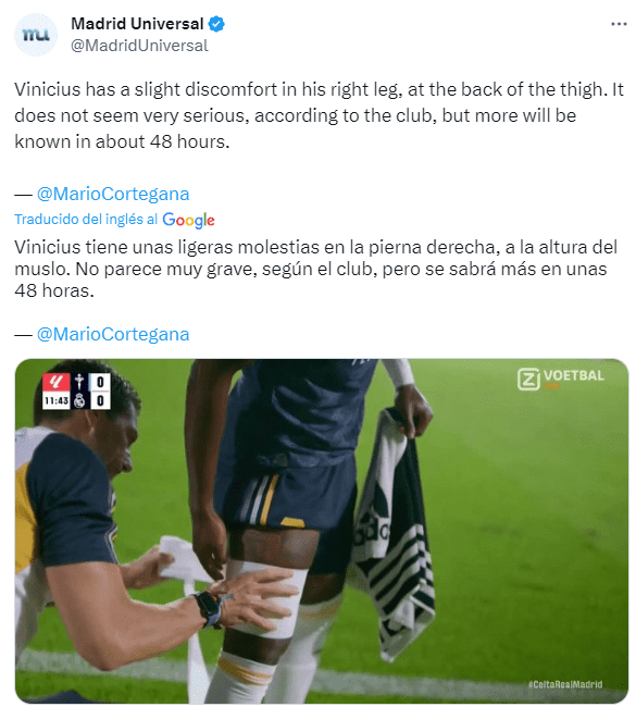 Estamos hablando de nada más y nada menos que Vinicius Jr, quien en el choque entre el Real Madrid y Celta de Vigo, en una carrera se terminó de sentir, al parecer sería en la parte de atrás de la pierna esta lesión, no se ha especificado que es, pero a falta de poco para los partidos de Eliminatorias, se ha conocido por ahora que son solo molestias, pero la respuesta aun se determinará en 48 horas con los análisis respectivos, que podrían dejarlo fuera del Perú vs Brasil.