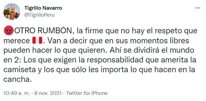 "La firme que no hay el respeto que merece Bandera de Perú. Van a decir que en sus momentos libres pueden hacer lo que quieren. Ahí se dividirá el mundo en 2: Los que exigen la responsabilidad que amerita la camiseta y los que sólo les importa lo que hacen en la cancha", escribió el periodista en sus redes.