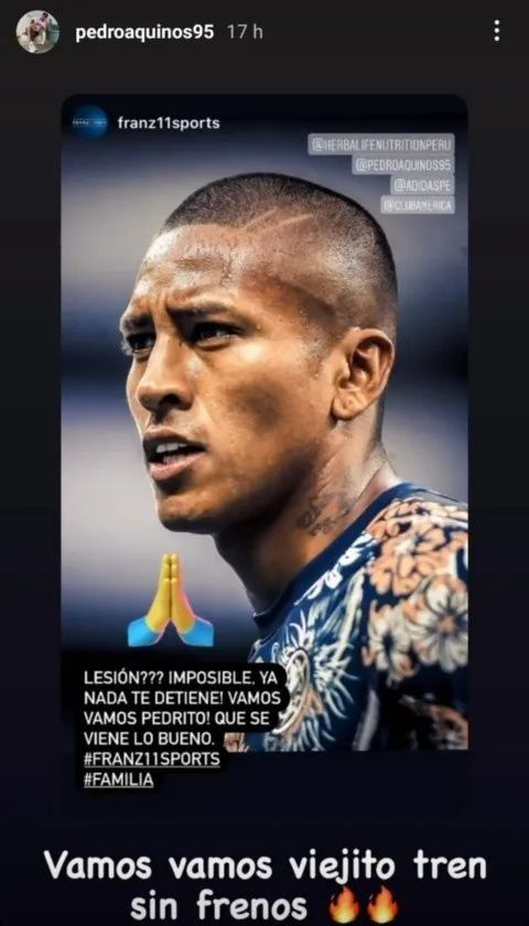 Esto lo confirmo el mismo jugador del América al subir una historia en su cuenta de Instagram al postear una publicación de otro usuario que decía "¿Lesión? Imposible. Ya nada te detiene. Vamos vamos Pedrito que se viene lo bueno", a lo que el jugador de la 'sele' respondió: "Vamos vamos viejito tren sin frenos".