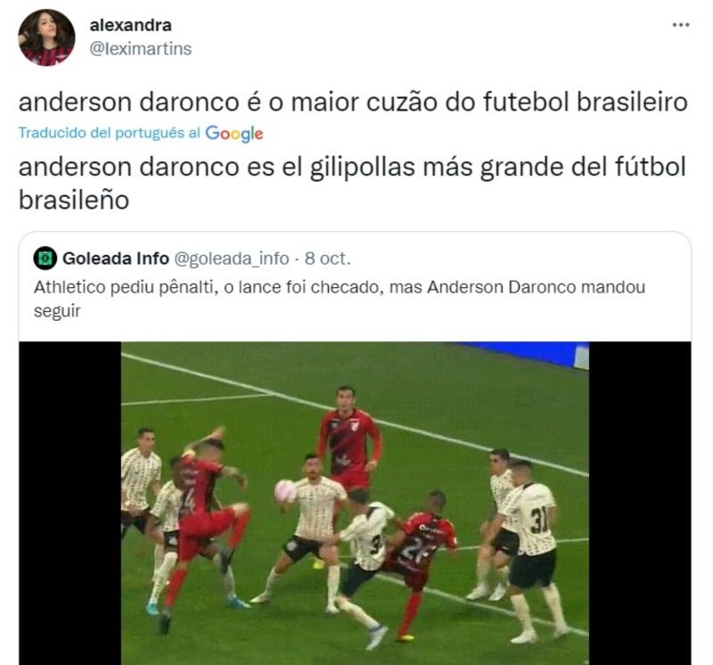 Y es que, según diversos medios brasileños afirmaron que la última perla de Daronco fue no cobrar un penal a favor de Athletico Paranaense en el duelo ante Corinthians por el Brasileirao. En las imágenes difundidas a través de Twitter, se ve a un jugador del ‘Timao’ poner la mano en su propia área, sin embargo Daronco no convalidó el penal, generando la ira de los hinchas del Paranaense, actual finalista de la Copa Libertadores. Cabe precisar que que este encuentro por la fecha 31 del Brasileirao terminó con la victoria del ex equipo de Paolo Guerrero por 2 a 1.
