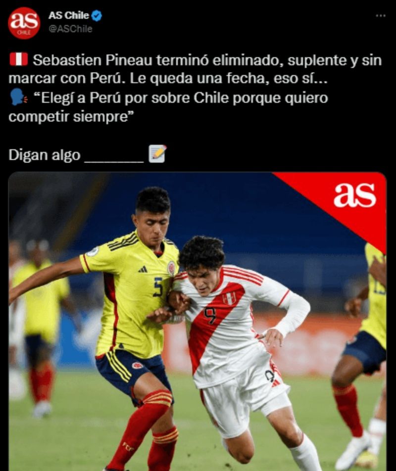 "Sebastien Pineau terminó eliminado, suplente y sin marcar con Perú. Le queda una fecha, eso sí... "Elegí a Perú por sobre Chile porque quiero competir siempre". Digan algo", reveló el diario AS Chile. Un comentario donde se aprovechan del rendimiento nefasto, por parte del joven atacante, y su combinado patrio. Razones no les faltan para criticar, pero quizás no era la forma.