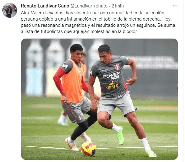 Pero Alex Valera la está pasando mal, tenía una oportunidad de oro para ser titular, con un Raúl Ruidíaz lesionado, un Gianluca Lapadula sin permiso para jugar, esto sin duda le caía muy bien, pero una lesión lo tiene días sin entrenar, como el Karma parece que lo terminará borrando de esta convocatoria. “Alex Valera lleva dos días sin entrenar con normalidad en la selección peruana debido a una inflamación en el tobillo de la pierna derecha. Hoy, pasó una resonancia magnética y el resultado arrojó un esguince. Se suma a lista de futbolistas que aquejan molestias en la bicolor”, se pudo conocer mediante el periodista Renato Landivar.