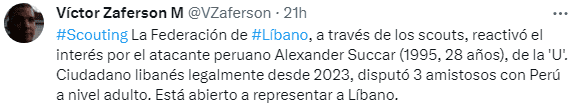 “#Scouting La Federación de #Líbano, a través de los scouts, reactivó el interés por el atacante peruano Alexander Succar (1995, 28 años), de la 'U'. Ciudadano libanés legalmente desde 2023, disputó 3 amistosos con Perú a nivel adulto. Está abierto a representar a Líbano”, publicó el Scout y periodista Víctor Zaferson en sus redes sociales, con lo cual Succar tendría una chance de poder jugar en la Selección de Líbano.