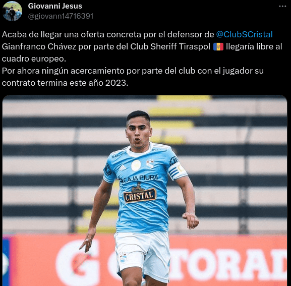 Según se ha conocido por el periodista Giovanni Jesús, Gianfranco Chávez estaría fichando por el cuadro del Sheriff Tiraspol, no ha habido ningún acercamiento por parte del conjunto de Sporting Cristal, así que está viendo de poder emigrar a Europa.
