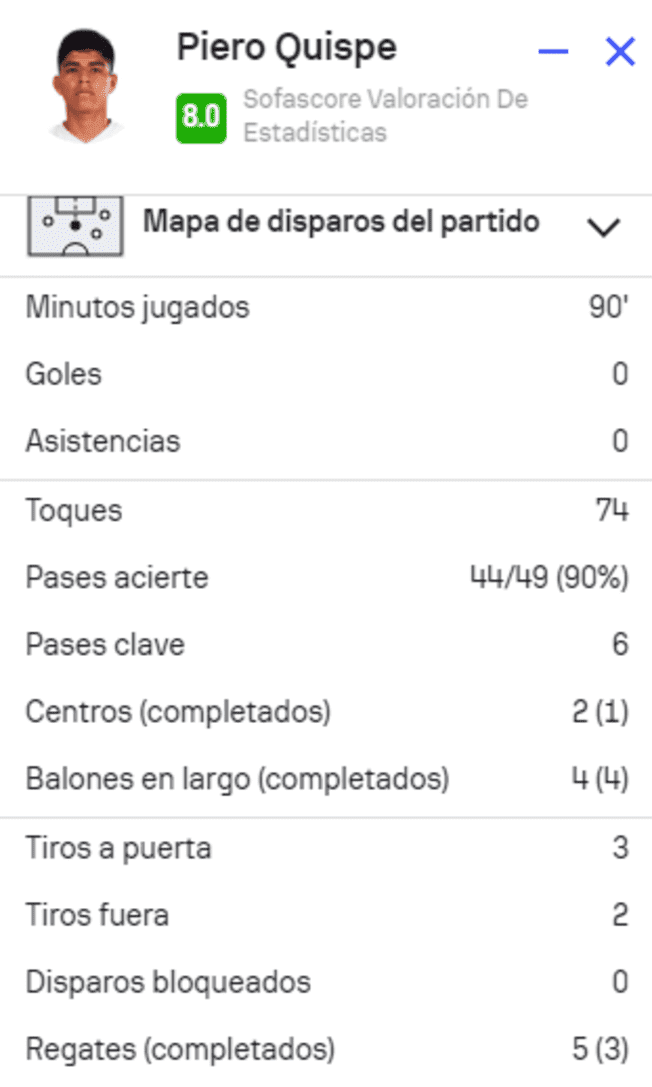 Si se puede analizar el presente de Piero Quispe es de solo buenos partidos y en el último choque fue de las grandes figuras, con Sofascore se puede reconocer que tocó el balón en un total de 74 veces, consiguiendo aparte 44 pases acertados de 49 posibles, lo que deja una efectividad del 90%, aparte de ellos, tuvo 4 balones en largo exitosos, lo mismo en disparos con un total de 5 remates, 3 al arco y 1 casi acaba en gol.