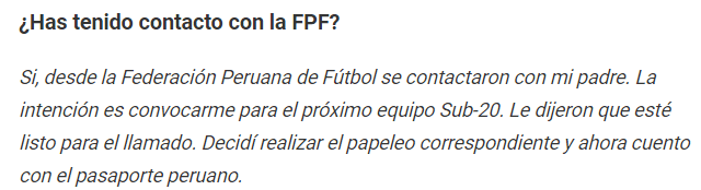 “Si, desde la Federación Peruana de Fútbol se contactaron con mi padre. La intención es convocarme para el próximo equipo Sub-20. Le dijeron que esté listo para el llamado. Decidí realizar el papeleo correspondiente y ahora cuento con el pasaporte peruano”, de igual forma, el jugador mencionó que podría ser llamado a la Selección Peruana, pero sin equipo es difícil, en algún momento se habló de Sporting Cristal, pero al parecer solo fue un rumor.