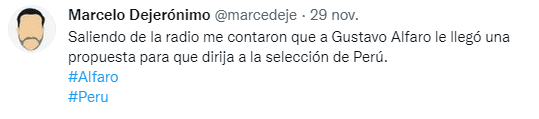 El periodista Marcelo Dejerónimo dio a conocer lo siguiente: “Saliendo de la radio me contaron que a Gustavo Alfaro le llegó una propuesta para que dirija a la selección de Perú", fueron las palabras del comunicador en sus redes sociales, algo que parece muy extraño, pues pareciera que dentro de la FPF están muy contentos con lo que hasta el momento ha hecho Juan Reynoso, quien está trabajando duro desde su llegada a la Selección Peruana.