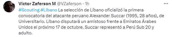 En este caso, Alexander Succar es el que le dice adiós a la Selección Peruana consiguiendo su llamado al cuadro del Líbano, de esta forma ya está más que seguro en jugar con este cuadro, con el cual justamente debutará ahora nada más, pues ya fue convocado para esta fecha doble. “La selección de Líbano oficializó la primera convocatoria del atacante peruano Alexander Succar (1995, 28 años), de Universitario. Líbano disputará un amistoso frente a Emiratos Árabes Unidos el próximo 17 de octubre. Succar representó a Perú Sub 20 y adulto”, dio a conocer Víctor Zaferson en sus redes sociales.