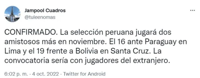 Según la información del periodista Jampool Cuadros de América TV, la selección peruana enfrentará a Paraguay en Lima el 16 de noviembre, y el 19 del mismo mes, visitará a Bolivia en Santa Cruz. Además, reveló que para esta convocatoria si se podría contar con jugadores del extranjero. "Confirmado. La Selección Peruana jugará dos amistosos más en noviembre. El 16 ante Paraguay en Lima y el 19 frente a Bolivia en Santa Cruz. La convocatoria sería con jugadores del extranjero", precisó el comunicador en Twitter.