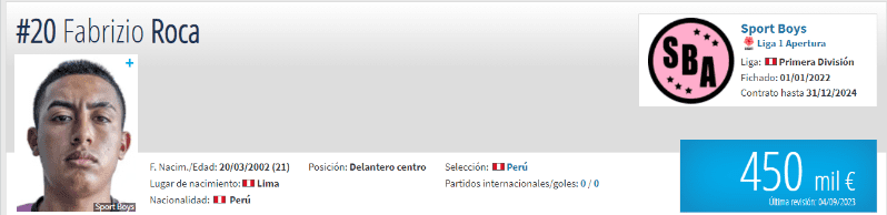 El delantero del Sport Boys del Callao de 21 años tiene un precio monetario en el mercado internacional de 450 mil euros, lo en moneda peruana daría un aproximado arriba de los 1,6 millones de soles, de acuerdo al portal especializado ´Transfermarkt´. Se espera que con dicha oportunidad de estar con la Selección Peruana pueda generar un crecimiento en su carrera y no solo en lo que representa en lo económico, sino también en el juego que pueda tener de aquí en más gracias al talento innato con el que cuenta.