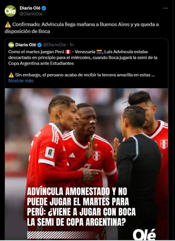 “Confirmado: Advíncula llega mañana a Buenos Aires y ya queda a disposición de Boca”; es la más reciente información con la que el reconocido diario ´Olé´ de Argentina soltó una tremenda bomba que viene siendo tendencia en el ámbito deportivo local por lo que representa que un jugador de tanta experiencia y recorrido en la Bicolor se haya hecho amonestar de una manera tan infantil, peor aún sabiendo que estaba en capilla para el siguiente encuentro ante la Selección Venezolana en el Estadio Nacional de Lima.