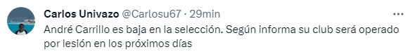 Se trata de André Carrillo, el futbolista del Al-Qadisiya tendría una lesión en el tendón de la corva, con lo cual su llegada al partido ante Chile y Argentina estaría básicamente descartado, lo cual va a ser un golpe para la Selección Peruana, pues si bien la ‘culebra’ no estuvo en su mejor momento, es titular absoluto y con esta baja, ahora el DT tendrá que ver a quien llamar, es un poco complicado pensar en un reemplazo en estos momentos, pero se va a tener que ver pronto un futbolista que pueda aportar al equipo.