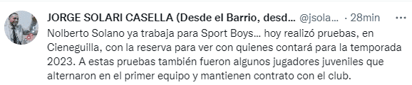 Ahora Nolberto Solano es el flamante fichaje de Sport Boys, en donde tendrá una misión muy complicada, que es no perder la categoría, esto se dice así, ya que normalmente el cuadro ‘rosado’ está complicado en lo económico, así que no tiene como reforzarse con jugadores de calidad, así que el estratega nacional está comenzando con su trabajo en tienda rosada. “Nolberto Solano ya trabaja para Sport Boys… hoy realizó pruebas, en Cieneguilla, con la reserva para ver con quienes contará para la temporada 2023. A estas pruebas también fueron algunos jugadores juveniles que alternaron en el primer equipo y mantienen contrato con el club”, expresó el periodista Jorge Solari.