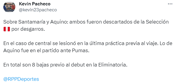 “Sobre Santamaría y Aquino: ambos fueron descartados de la Selección por desgarros. En el caso de central se lesionó en la última práctica previa al viaje. Lo de Aquino fue en el partido ante Pumas. En total son 8 bajas previo al debut en la Eliminatoria”, reveló el periodista Kevin Pacheco sobre estas lesiones las cuales sin duda alguna afectan bastante a la Selección Peruana al ser grandes referentes.