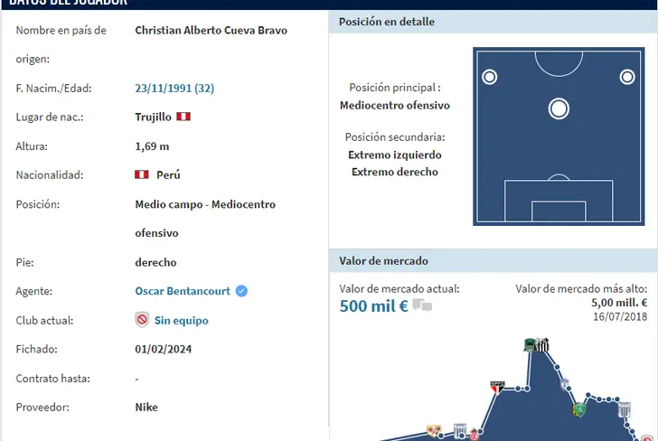 Según el portal especializado ‘Transfermarkt’, podemos apreciar que Christian Cueva tiene una cotización internacional de 500 mil euros, lo que en soles daría un aproximado cercano a los 2 millones. Claramente, no es el mejor precio en toda su trayectoria deportiva, aunque desde el aspecto netamente futbolístico podría encontrar algo de paridad si es que realmente se pone las pilas y sobre todo se enfoca en jugar y nada más, ya no en estar apareciendo en escándalos ni en portadas de los programas de espectáculos más conocidos del país.