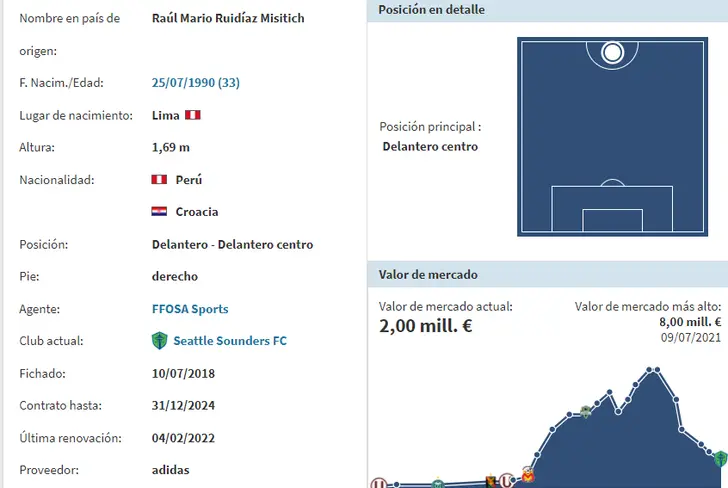 El delantero nacional de 33 años tiene un precio monetario de 2 millones de euros, lo que en soles daría un promedio cercano a los 8 millones, de acuerdo al portal especializado ´Transfermarkt´. Hoy ya no puede hacer nada al respecto y mientras la Selección Peruana está casi eliminada de la Copa América tras haber pedido ayer ante Canadá en Kansas City, Raúl Ruidíaz la sigue haciendo linda con el Seattle Sounders de la MLS de los Estados Unidos.
