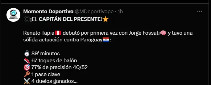 Renato Tapia fue uno de los mejores jugadores de la cancha en el más reciente duelo entre Perú y Paraguay disputado en el Estadio Monumental de Ate. A raíz de este gran regreso al equipo de todos como titular y en su posición natural como es la de volante, acaba de ser bautizado con un nuevo apodo que viene llamando poderosamente la atención de los medios deportivos a nivel local. ´El Capitán del Presente´ es como ahora será reconocido el mediocampista.