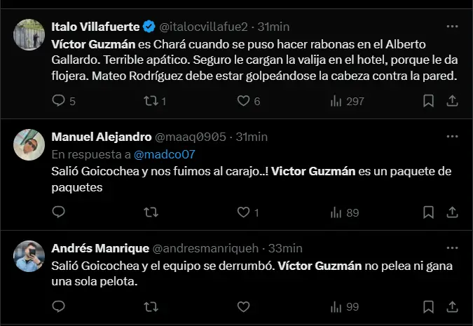 Diversos analistas y exfutbolistas han cuestionado el rendimiento de Guzmán. Roberto "Chorri" Palacios, por ejemplo, ha señalado que al joven delantero le falta mucho por mejorar en aspectos como el juego aéreo y la definición. Otros expertos han coincidido en que Guzmán necesita trabajar más duro para alcanzar su máximo potencial.
