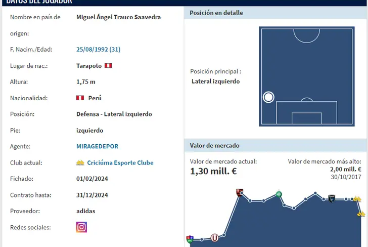 Según la web 'Transfermarkt', Miguel Trauco tiene una cotización internacional de 1,3 millones de euros, lo que en soles daría un promedio cercano a los 5,2 millones. Si con estos rendimientos del presente en el Criciúma del Brasileirao no forma parte de los planes de la Selección Peruana, la verdad es que Jorge Fossati se ganaría nuevas críticas en el medio local, más aún cuando el equipo en estos momentos necesita de categoría y jerarquía para salir del mal momento en el que se encuentra en las Eliminatorias Sudamericanas rumbo a la Copa del Mundo 2026.