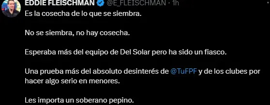 Fleischman, a través de su cuenta de ‘X’ (antes Twitter), no escatimó palabras para expresar su decepción y señalar a los responsables de este nuevo fracaso. "Es la cosecha de lo que se siembra. No se siembra, no hay cosecha. Esperaba más del equipo de 'Chemo' Del Solar pero ha sido un fiasco. Una prueba más del absoluto desinterés de FPF y de los clubes por hacer algo serio en menores. Les importa un soberano pepino", escribió Fleischman.
