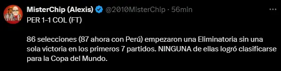 Malas noticias para la Selección Peruana, pues tendría difícil ir al próximo mundial del 2026 tras el dato que ha dado Misterchip, quien dio a conocer que los países que no lograron ganar uno de sus siete primeros partidos en las Eliminatorias no pudieron ir a una Copa del Mundo, con lo cual el equipo de Jorge Fossati podría ir por ese camino, por el momento son últimos en la tabla de posiciones con solo tres puntos.