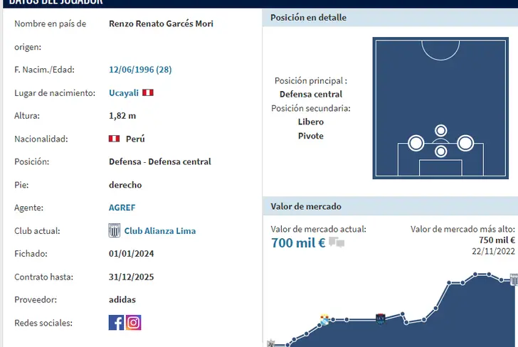 Renzo Garcés de 28 años tiene una cotización monetaria de 700 mil euros, lo que en soles daría un promedio cercano a los 2,8 millones, según el portal especializado ´Transfermarkt´. Bueno, por ahora solo le queda seguir marcando la diferencia y dando la talla en Alianza Lima en lo que resta de la temporada 2024, así que a partir de dichos futuros escenarios ya podría ser tomado en cuenta en la Selección Peruana si es que Jorge Fossati lo considera de cara a la reanudación de las Eliminatorias Sudamericanas.