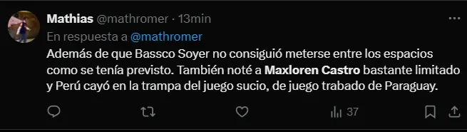 El desempeño de Maxloren Castro el día de hoy ante Paraguay ha sido decepcionante hasta el momento. Sin embargo, es importante no juzgarlo por un solo partido. El joven delantero tiene un gran futuro por delante y debe seguir trabajando para mejorar su juego.