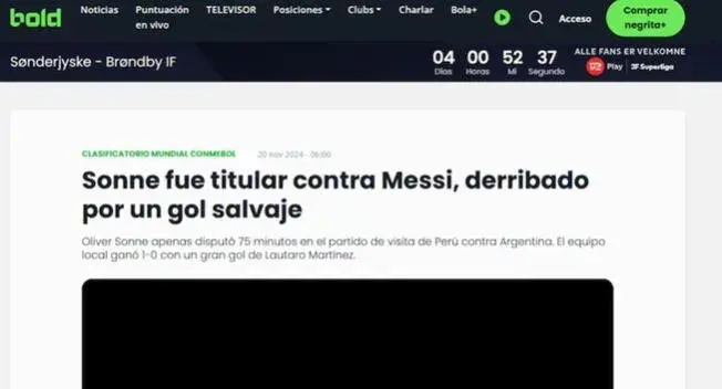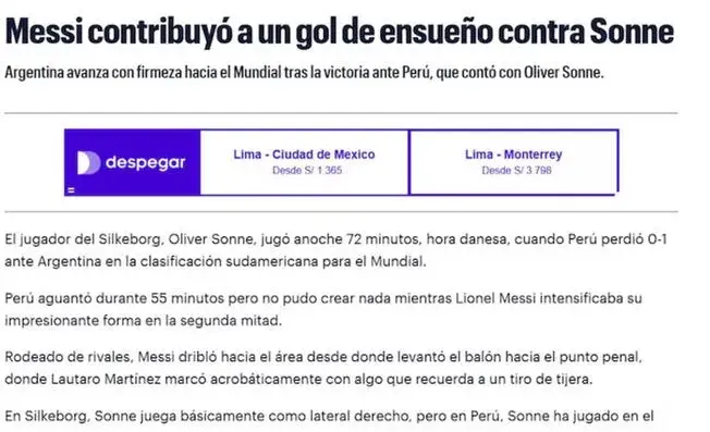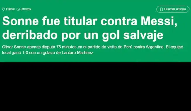 "Sonne fue titular contra Messi, derribado por un gol salvaje", tituló "Bold". Esta frase resume a la perfección el partido del jugador peruano-danés, quien se enfrentó a un rival de talla mundial y fue testigo de un gol de alta calidad. Por su parte, "Ekstra Bladet" también hizo hincapié en la titularidad de Sonne y en su desempeño en el campo: "Oliver Sonne apenas disputó 75 minutos en el partido de visita de Perú contra Argentina", señalaron.