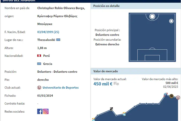 De acuerdo con el portal internacional 'Transfermarkt', podemos apreciar que Christopher Olivares tiene un valor internacional de 450 mil euros, lo que en soles equivale a aproximadamente 1,8 millones. También veremos qué decisión toma el popular 'Zancudito' con respecto a su continuidad en Universitario de Deportes, ya que el mercado de fichajes aún está abierto y podría cambiar de equipo sin problemas. Por lo tanto, las expectativas están puestas en cómo se preparará para competir de la mejor manera posible y, por qué no, soñar con la oportunidad de ser convocado a la Selección Peruana, que actualmente está siendo dirigida por el profesor Jorge Fossati.