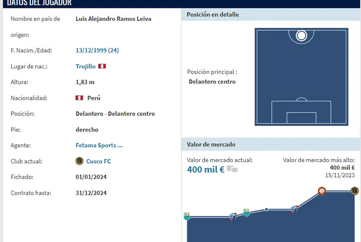El delantero peruano de 24 años, Luis Ramos, tiene un valor de mercado de 400 mil euros, lo que equivale a aproximadamente 1,6 millones de soles, según el portal especializado 'Transfermarkt'. Es importante destacar la necesidad de incorporar un nuevo atacante a la Selección Peruana, ya sea en este momento o en el futuro. Esto dependerá de las decisiones que tome el entrenador Jorge Fossati, especialmente considerando los próximos partidos de las Eliminatorias Sudamericanas en octubre y noviembre.