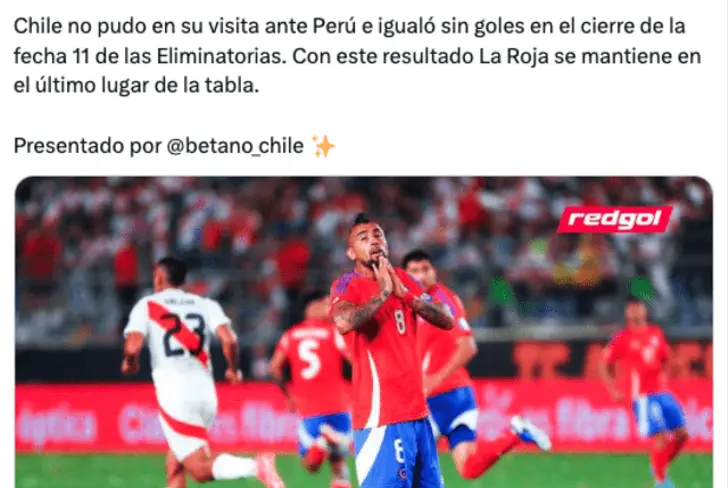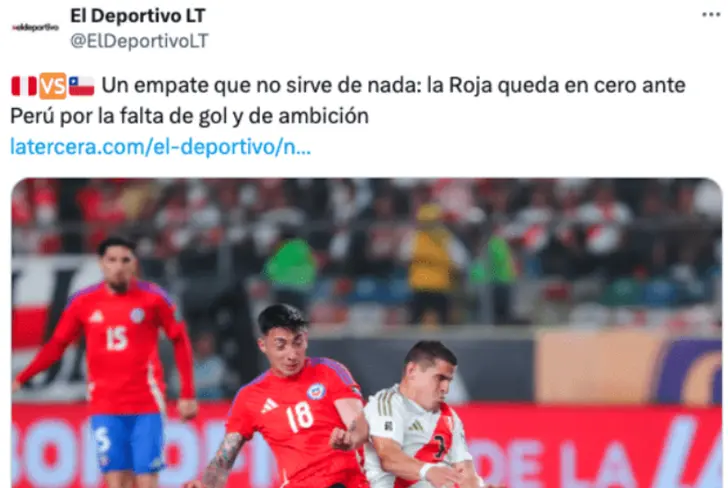 La prensa chilena ha sido unánime en señalar que el empate ante Perú es un resultado que no aporta nada a las aspiraciones de la Roja de clasificarse al Mundial 2026. Medios como RedGol han destacado que "Chile no pudo en su visita ante Perú e igualó sin goles en el cierre de la fecha 11 de las Eliminatorias. Con este resultado, La Roja se mantiene en el último lugar de la tabla".