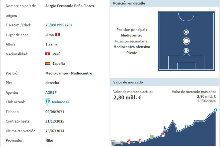 De acuerdo al portal especializado ‘Transfermarkt’, podemos ver que Sergio Peña tiene un precio internacional de 2,8 millones de euros, lo que en soles daría un promedio cercano a los 11,2 millones. Con 28 años de edad y un buen presente de continuidad en el Malmo de Suecia, ha quedado en evidencia que trasladó dichos rendimientos de su club a la Selección Peruana, así que en el papel habría que sacarle el máximo provecho como el conductor que necesita la Era Fossati en esta etapa de las Eliminatorias Sudamericanas rumbo al Mundial 2026.