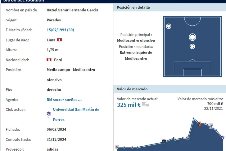 De acuerdo al portal especializado ‘Transfermarkt’, podemos apreciar que Raziel García tiene una cotización internacional de 325 mil euros, lo que al cambio de la moneda peruana daría un promedio cercano a los 1,3 millones. Su mejor precio a nivel mundial fue de 700 mil euros, lo que al cambio de la moneda peruana daría un aproximado de 2,8 millones, cuando en el año 2021 defendía la camiseta del Cienciano del Cusco y luego partiría al Deportes Tolima de Colombia como uno de los fichajes peruanos más importantes en el último tiempo, pero en donde no pudo marcar la diferencia.