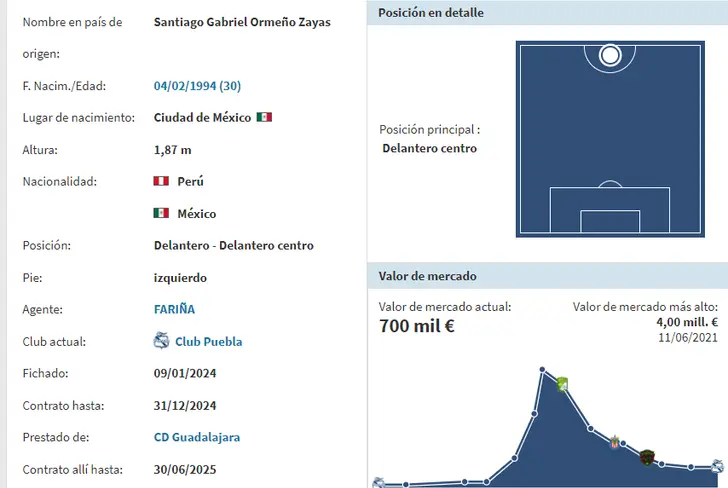 El delantero peruano-mexícano de 30 años tiene una cotización monetaria de 700 mil euros, lo que en soles daría un promedio cercano a los 2,8 millones, de acuerdo al portal especializado ‘Transfermarkt’. Viene jugando en el Club Puebla de la Liga MX, aunque durante el último semestre no ha sido capaz de marcar la diferencia ni ser el goleador que en su debido momento demostró ser, por lo que solo cambiando dicho presente tendría alguna posibilidad de volver a la Selección Peruana.