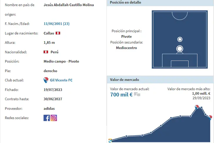 El volante nacional de 23 años tiene una cotización internacional de 700 mil euros, lo que en soles daría un promedio cercano a los 2,8 millones, de acuerdo al portal especializado ´Transfermarkt´. Ahora queda esperar si es que el profesor Jorge Fossati opta por este panorama y decide poner a Jesús Castillo en el lugar que dejó vacante Miguel Araujo en la línea de 3 defensores, mientras que Anderson Santamaría podría volver a esperar su oportunidad en el banco de los suplentes.