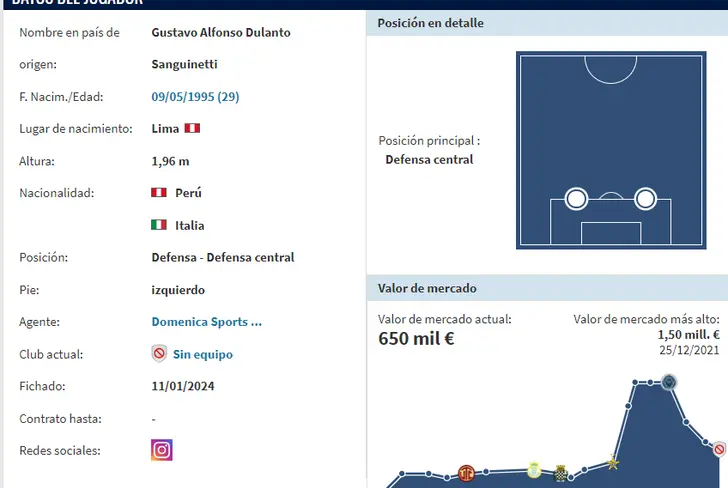 El zaguero central de 29 años tiene un precio monetario en el mercado de 650 mil euros, lo que en soles daría un aproximado cercano a los 2,6 millones, de acuerdo al portal especializado ´Transfermarkt´. Los hinchas merengues esperan que pueda acoplarse de la mejor manera a la idea de juego del profesor Fabián Bustos pensando en el Torneo Clausura y a partir de este escenario favorable todo se le haría mucho más factible en la posibilidad de sumarse a las planificaciones de Jorge Fossati en la Bicolor.