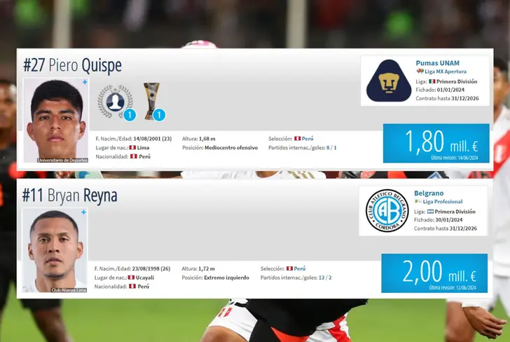 Según el portal especializado ‘Transfermarkt’, podemos apreciar que Bryan Reyna tiene un precio internacional de 2 millones de euros y Piero Quispe vale 1,8 millones de euros, lo que sumado daría un total 3,8 millones de euros y lo que al cambio de la moneda peruana tendría un resultado cercano a los 15,2 millones. Son de los jugadores con mejor cotización de la Selección Peruana y, al margen de ello, también representa ser de los más calidosos para ser parte del 11 titular bicolor para enfrentar a Ecuador.