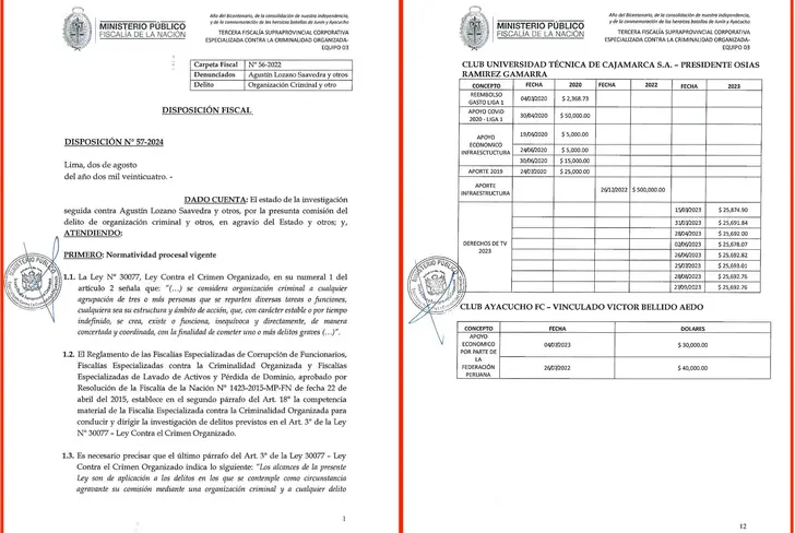 "La carpeta fiscal, de código 56-2022, protagonizada por Agustín Lozano, abarcaba inicialmente de 2019 a 2022. En octubre pasado, luego de que la Fiscalía allanó por tercera vez la Videna, encontró irregularidades contables en la FPF durante el 2023. Las primeras auditorías dan cuenta de que Lozano hizo mal uso de S/8.3 millones de la FPF" y "Otros beneficiados económicamente fueron el Sport Huancayo, que entre 2018 y 2023 obtuvo préstamos por S/3 millones. El club Juan Aurich recibió S/ 1.8 millones, la Academia Deportiva Cantolao S/ 938 716, el club Atlético Grau de Piura S/ 872 557 y la Liga Departamental de Tacna S/ 800 mil"; fueron algunas de las premisas explicadas por parte del reconocido portal ‘El Foco’ respecto al caso del presidente de la FPF.