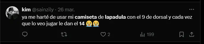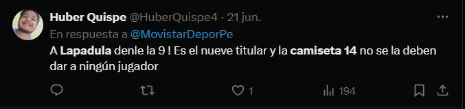 “Esta con la 14 de Pizarro el salado”, “Que cambie de número de camiseta”, “A Lapadula denle la 9. Es el nueve titular y la camiseta 14 no se la deben dar a ningún jugador” y “Ya me harté de usar mi camiseta de Lapadula con el 9 de dorsal y cada vez que lo veo jugar le dan el 14”; son algunos de los comentarios más resonantes y llamativos que se pueden apreciar en las redes sociales ante un pedido incesante para que el ´Bambino´ pueda cambiar de dorsal ya mismo.