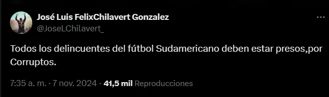 Con frases contundentes como "Todos los delincuentes del fútbol sudamericano deben estar presos, por corruptos" y "Todos los presidentes de la ‘Corrupbol’ están sucios y contaminados por la corrupción. La verdad triunfa siempre", Chilavert ha dejado clara su posición frente a este escándalo que sacude al fútbol continental.