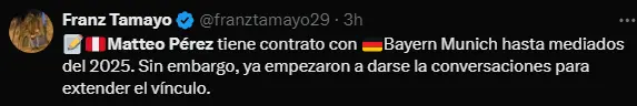 En Bayern Múnich están contentos con el talento de Matteo Pérez, por eso se ha conocido mediante Franz Tamayo, que ya están buscando aumentar su vínculo contractual, el cual terminaría el próximo año, pero viendo como va todo, buscarían que siga teniendo en futuro dentro del club.